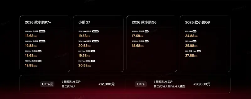 2026小鹏全球新品发布会的四款车型 Ultra和Ultra SE 版均将搭载小鹏自研第二代 VLA,即行业首个实现L4初阶能力的物理世界大模型。按照规划,第二代VLA将于2026年3月开启首批车辆推送。