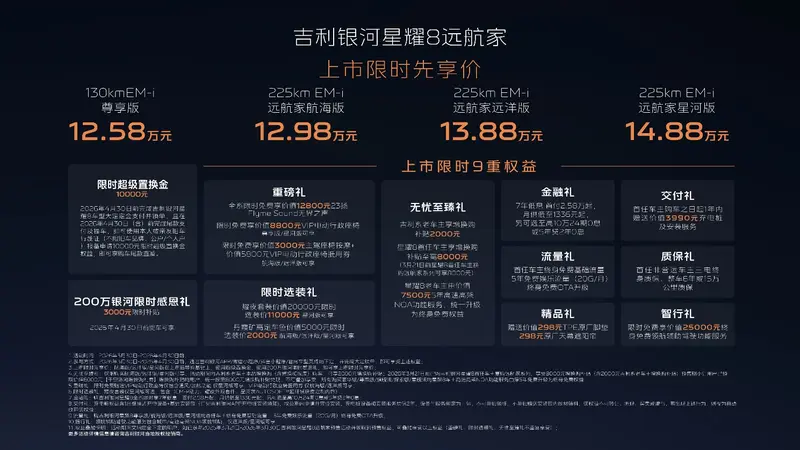 3月30日,吉利银河星耀8远航家系列加新上市,在原有130km EM-i尊享版基础上,吉利银河星耀8远航家系列新增225km EM-i远航家航海版、225km EM-i远航家远洋版、225km EM-i远航家星河版三个续航225km版型,上市限时先享价12.98~14.88万元。