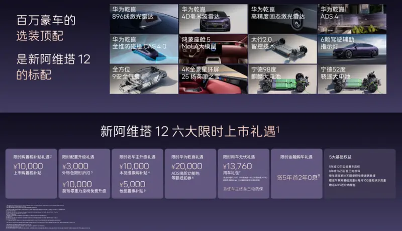 新阿维塔12号称全系标配12项“顶格配置”,包括:
