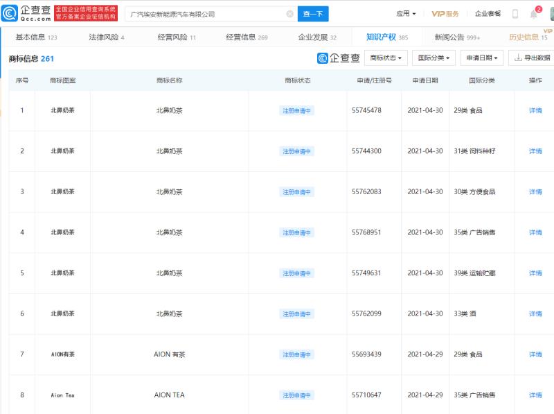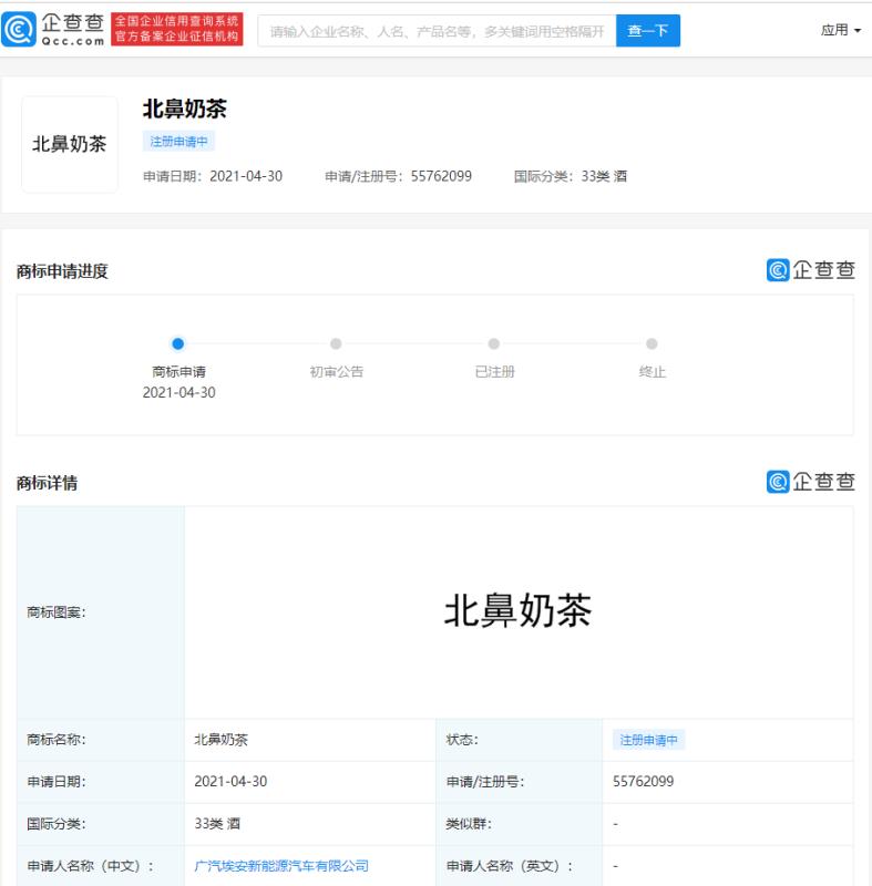 企查查APP显示,近日,广汽埃安新能源汽车有限公司申请注册“北鼻奶茶”、“埃安有茶”、“AION TEA”、“独角北鼻的茶”等商标,国际分类涉及29类 食品、33类 酒、30类 方便食品等。目前商标状态多为“注册申请中”。